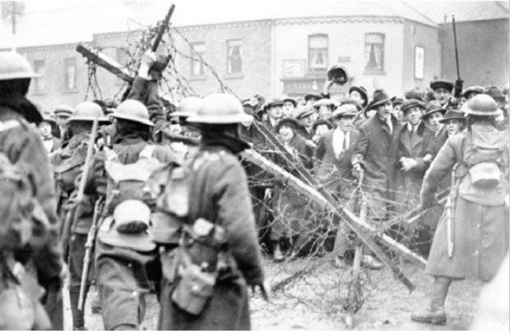 CK: The biggest left tradition active in Ireland was syndicalism. The Irish Transport and General Workers Union was modeled on the Industrial Workers of the World and at its peak had 100,000 members. Transport union organisers led mass strikes and ‘soviet’ takeovers. Unfortunately for the left, the two main figures in building the ITGWU were absent during these critical years. James Connolly had been executed following his leadership of the Easter Rising of 1916, a failed insurrection largely driven by the IRB. Jim Larkin, founder of the ITGWU had been jailed in America.