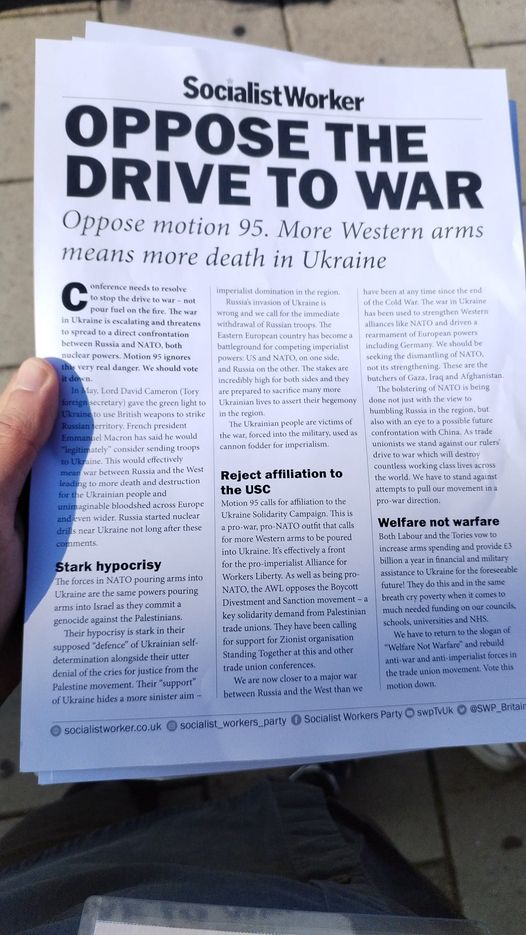 Next we have the propaganda of the British Socialist Worker, whose leaflet authors are unable to understand, or accurately report, the policy of the pro-Ukraine left.